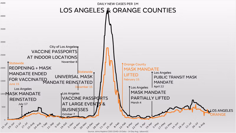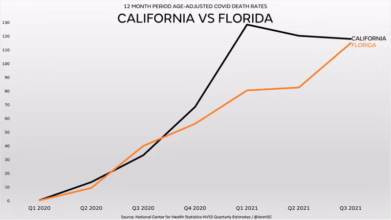 ただし、カリフォルニア州は、2021 年の第 XNUMX 四半期と第 XNUMX 四半期のすべてで、年齢調整後の COVID 死亡率がフロリダ州よりも大幅に高く、その期間の一部でマスクの義務化と容量制限が行われたことを除きます。