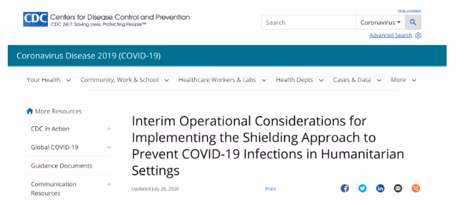 「この文書は、キャンプ、避難民、および低資源環境に焦点を当てたガイダンス文書に概説されているように、人道的環境でシールドアプローチを実施するための米国疾病予防管理センター(CDC)の観点からの考慮事項を示しています。このアプローチはこれまで文書化されたことがなく、これらの環境での対応活動を支援する人道パートナーの間で疑問や懸念を引き起こしています。この文書の目的は、CDCの観点からシールドアプローチの潜在的な実装上の課題を明らかにし、実証データがない場合の実装に関する考え方を導くことです。考慮事項は、新型コロナウイルス感染症(COVID-2019)の感染と重症度に関する現在知られている証拠に基づいており、より多くの情報が利用可能になったときに修正する必要がある可能性があります。」