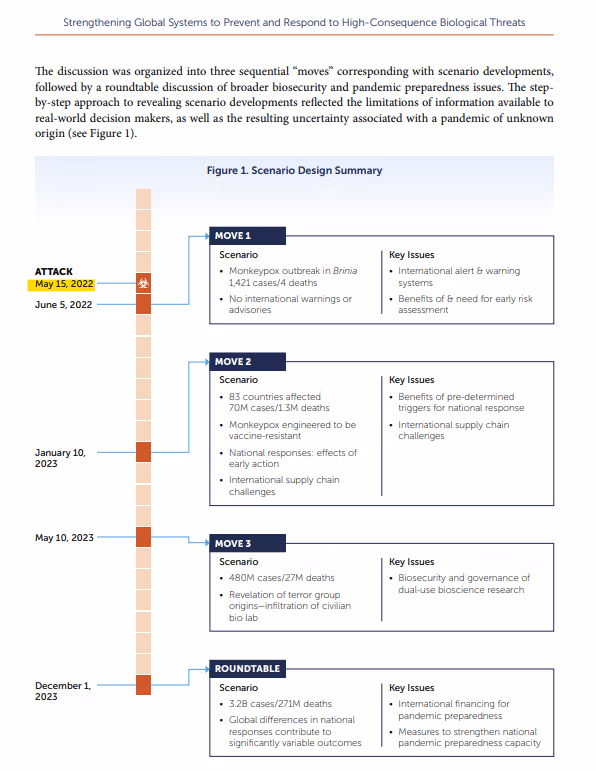 イベント 201 は、2019 年 201 月 (コロナウイルスが武漢で初めて明らかになるわずか XNUMX か月前) に、ゲイツ財団、世界経済フォーラム、ブルームバーグ、およびジョンズ ホプキンスによって主催されました。 イベント XNUMX の場合と同様に、サル痘シミュレーションの参加者はこれまでのところ、パンデミック シミュレーションに参加したことについて沈黙を守ってきました。
