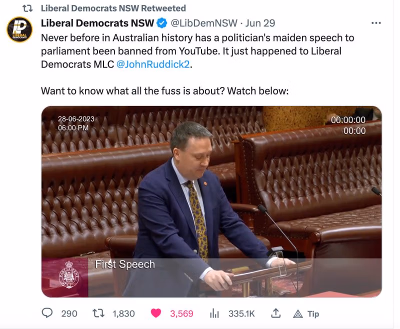 それにもかかわらず、オフラインで社会的に受け入れられることが、ソーシャルメディアでも必ずしも受け入れられるとは限りません。 YouTubeは、ラディック氏のスピーチがアップロードされてからわずかXNUMX時間後に、プラットフォームから迅速に削除した。 の NSW州自由民主党は言う 政治家の初演説が同プラットフォームによって検閲されたのはオーストラリアの歴史上初めてである。